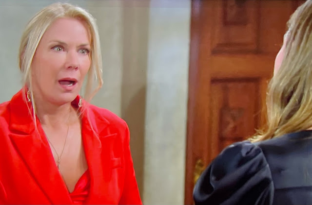 Brooke returns downstairs in her lingerie and is stunned to see Ridge still there. Ridge admires her lingerie and says “Lucky sheets“. Brooke tells Ridge she wants to honor her pact with Taylor.