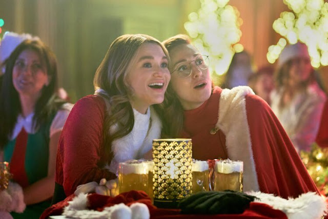 In this movie, Jordin (King), Ava (Groening) and Stella (Sy) are three best friends who head out for a night on the town to take part in the annual Santa Summit, an event where revelers don Santa suits and visit local spots on the circuit to eat, drink and be merry in true holiday fashion… and set out to find a secret Santa (Hollingsworth) Jordin connected with at the start of the night’s festivities. (Photo: Hallmark)