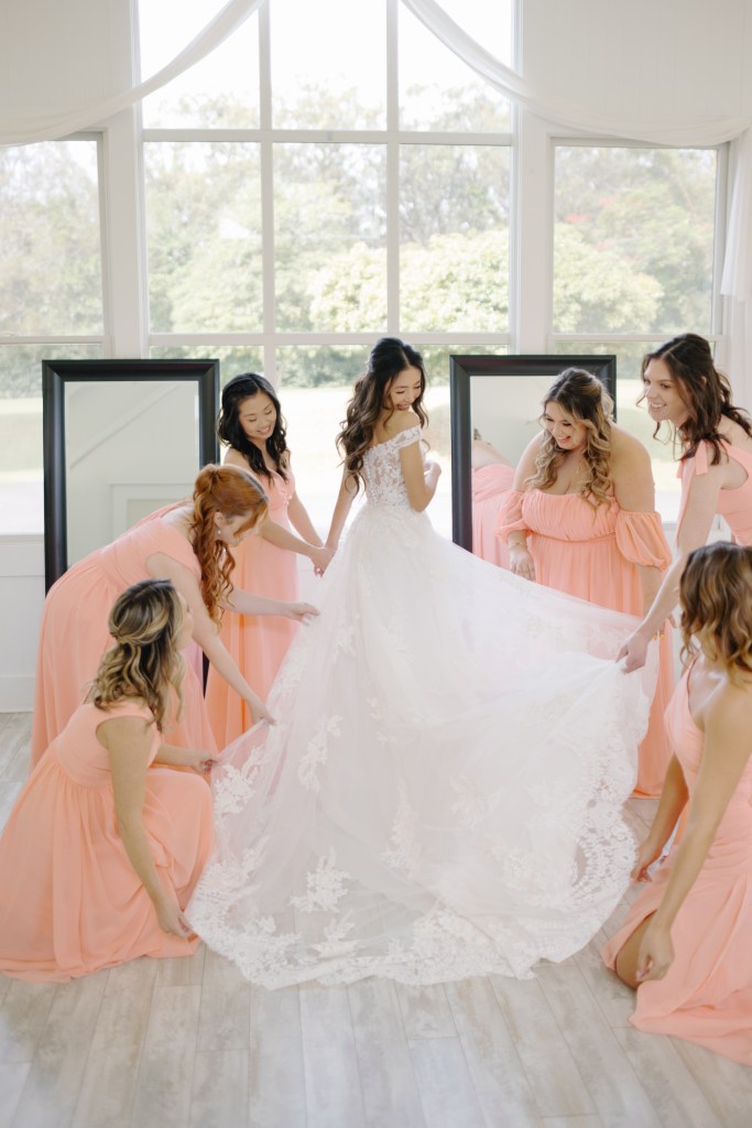 With some fabulous help from her makeup artist and hairstylist, Erika Kakailai, a stunning dress by Justin Alexander, the wedding talents of planner Jonah Leland, and the floral geniuses at La Flor, the couple was dressed to the nines for their big day, one they’ll never forget. See some photos below!