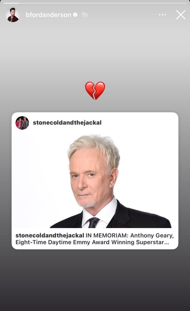 Antonio Sabato Jr. (ex-Jagger) penned: My dear friend, Anthony Geary, has passed away at 78. I had the privilege of working with him and Cherie every moment. He was a true legend, a mentor and like a big brother to me. His spirit and talent will always be remembered. Rest in peace, Anthony.