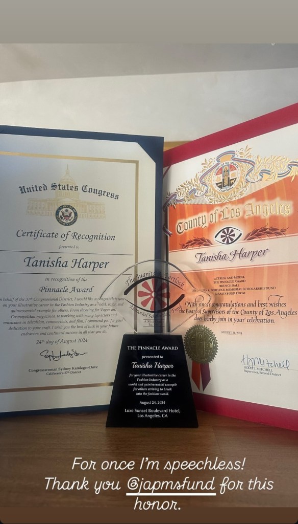 On August 24, Tanisha Harper from General Hospital received the prestigious Pinnacle Award from The Juanita A. Portlock Memorial Scholarship Fund in honor of her outstanding contributions to the fashion industry. This recognition celebrates her illustrious career as a model, actor, and inspiring figure for aspiring individuals in the fashion world.