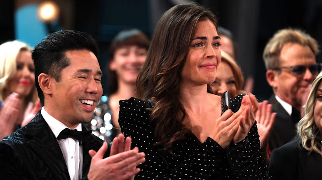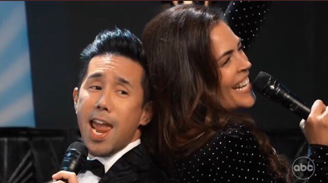 Parry Shen revealed, “We got the rights to the song on a Thursday, laid down our vocals in the recording studio 4 days later, and then sang to our track 3 days later when filming the episode. So a week from start to finish. I screenshot the text I sent to Kelly, when I found out she was singing Aretha’s part — but I knew she could do it from hearing her previously sing a tiny bit during our signing. Our mics during the taping were live to record any additional laughter or improvisations, but our own track kept us in time and was also there to ‘assist’ if/when we ran out of breath (you forget how different it is to sing AND dance!) I knew I wanted to do a 360 degree mic twirl & practiced at home until I nailed it. But then I discovered the mics we were using on the show were longer and much heavier and impossible to do a 360 flip. So I cheated. When the vocals went over to Kelly, I did a 180 flip and when the vocals came back to me, I did another 180 flip. Kin Shriner took notice afterwards and said, “When I saw you trying to flip the mic, I was thinking, ‘Yeah, good luck with that!’ But then you did it!!” So I revealed my secret to him — and delighted that someone noticed!“